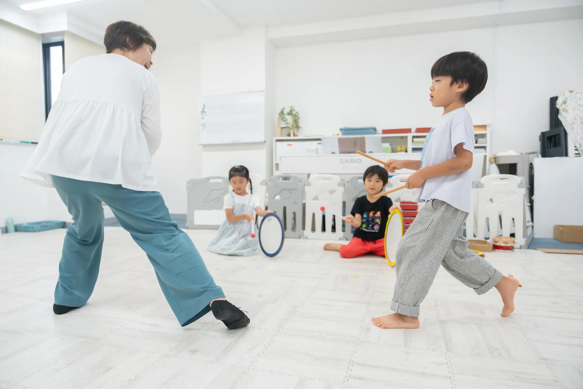 リトミックのレッスンのなかで行われる「音楽遊び」には正しい知識や理論が必要であり、教育的な意義があります。一見「お遊戯」や「ダンス」に見えますが、決められた形で身体を動かすのではなく、自分で考え、判断し表現します。この自主性を尊重するスタイルが子どもたちの個性を伸ばしていきます。